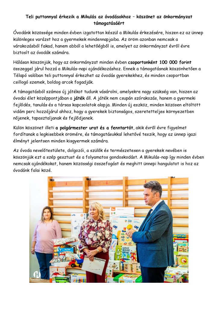 Hódmezővásárhelyi Egyesített Óvoda 12 telephelyére járó több mint 830 gyermek nevében köszönjük a Hódmezővásárhely Városáért Közalapítványnak, hogy támogatásban részesítették intézményünket, a sporteszközök (gyermekkerékpárok) nagy mértékben hozzájárulnak óvodánk egyik fő feladatának az egészséges életmódra nevelésnek és mozgásfejlesztésnek színvonalas megvalósításához.