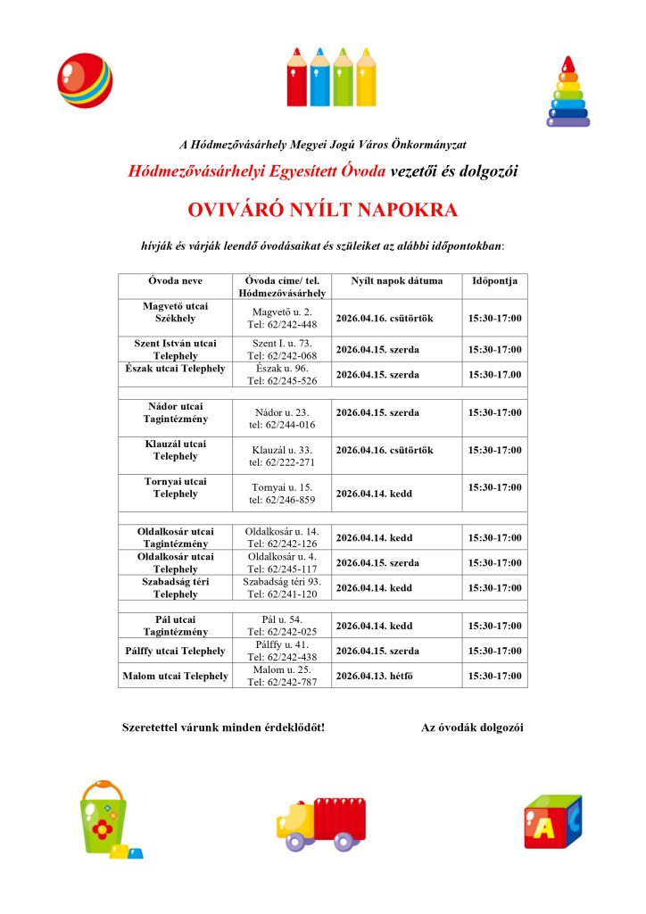 Mind a 12 óvodánkba (Magvető utcai Székhely, Pál utcai Tagintézmény, Oldalkosár14. Tagintézmény, Nádor utcai Tagintézmény, Malom utcai, Pálffy utcai, Szent István utcai, Észak utcai, Oldalkosár 4. utcai, Szabadság téri, Klauzál utcai, Tornyai utcai Telephelyek) várjuk 2025 április 28.-án (hétfőn) és április 29.-én (kedden) 8.00 – 17.00 óráig a beiratkozó szülőket, gyermekeket.