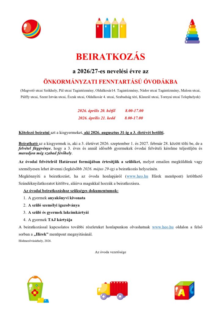 A 2025/2026-os nevelési évre szóló óvodai beiratkozások a Hmvhely M. J. V. Önkormányzat Hódmezővásárhelyi Egyesített Óvodában az alábbiak szerint történnek: